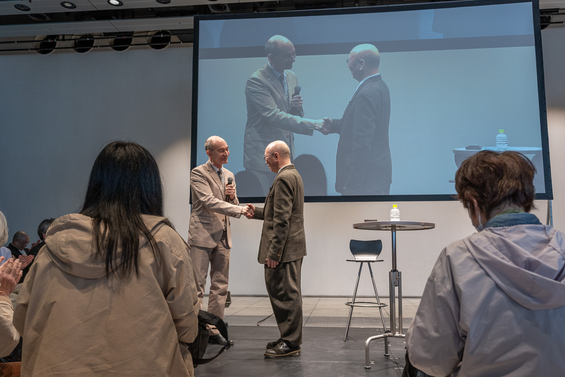 会の最後には、後任のロバート キャンベル新館長を壇上に招き、ご紹介。キャンベル新館長は、「多様性や機会の均等性に対して逆風が吹き荒れる世界の中で、一人一人の価値や学び、遊び、そしてこれからの時代にふさわしい形を新館長として作っていきたい。」と抱負を語られました。鷲田館長とキャンベル新館長へのエールとしての拍手は終わること無く、いつまでも会場に響き、トーク終了後も、鷲田館長を慕う多くの人々の長い列がいつまでも続きました。